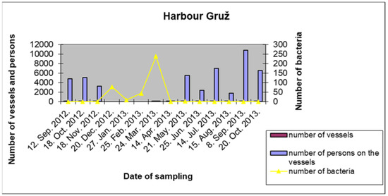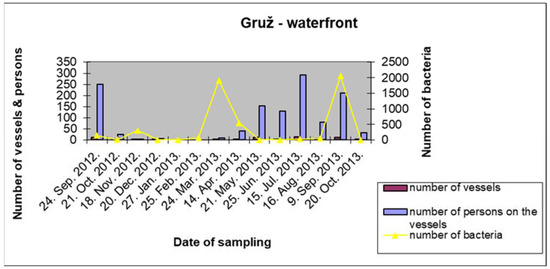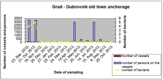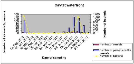 The results in Table 4 show that we found no bacteria in the water when cruise ships were berthed in the port. During the four months of the winter, when there were no ships in the port, bacteria was detected in the samples during the months from December 2012 through April 2013 because road reconstruction and installations under the road (from the marketplace to the church and monastery of St. Cross) were occurring. A network of new higher-capacity pipes for rainwater, new sewage pipes, and new power and telephone cable lines was installed. Therefore, at that time, until the completion of the works, the sewage of that part of the city was discharged directly into the sea, which was the cause of the increased number of bacteria in the samples in the port of Gruž along the waterfront. A graphical representation of the results from Table 4 is provided in Figure 7.