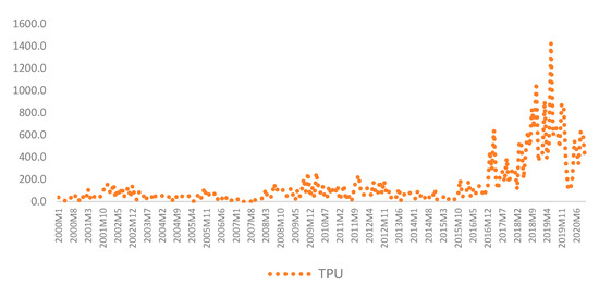 We first use the trade policy uncertainty (TPU) measured by text data, from Davis et al. [28]. The trade policy uncertainty measured by the time-varying volatility model is used for later robustness analysis. This method (Davis et al. [28]) first sets a package of text keywords that can represent policy uncertainty: uncertain, unclear, indefinite, unknown, unpredictable, difficult to estimate, unexpected. Secondly, keywords related to trade policy are set for establishing TPU: import tariff, import tax, import barrier, WTO, Uruguay Round, GATT, trade barrier, export subsidy, protectionism, dumping, trade law, and protectionism. Finally, the index construction is finished through statistics of the frequencies of TPU-related keywords in Chinese involved in the articles published on People’s Daily and Guangming Daily every month. The index construction results are shown in Figure 1.