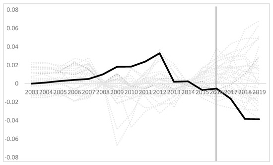 To verify the robustness of the above conclusion, we borrowed the placebo test method of Abadie et al. [33]. The idea is to successively conceive each country of the control group as an experimental group—that is, assuming that only that country experienced the positive impact of trade policy uncertainty in 2016 (2017)—while the remaining countries are included in the control group (including China). Then, the synthetic control method is used to estimate the treatment effect of trade policy uncertainty on the TFP of that country—that is, to estimate the difference between the true TFP result variable of the country and the result variable of “synthetic China”. Following this idea, we carried out the above operations on all the countries of the original control group, obtained the distribution of the treatment effects, and then compared them with the treatment effect of China. If some countries in the original control group have a similar performance to China—that is, the true TFP result variable is far smaller than the result variable of “synthetic China” after intervention—it suggests that the above conclusion that “trade policy uncertainty suppresses total factor productivity” is not robust. It should be noted that under the synthetic control method, the synthetic result variable is a convex combination of individual result variables in the control group, which will inevitably lead to poor fitting effects for some countries with extreme values and, thus, incredibility of the estimation results. Therefore, in a placebo test of the outcome variables, we excluded countries with poor fitting effects and only retained those countries for which the root-mean-square prediction error (RMSPE) relative to China’s RMSPE before policy intervention differed by a factor of less than 3.