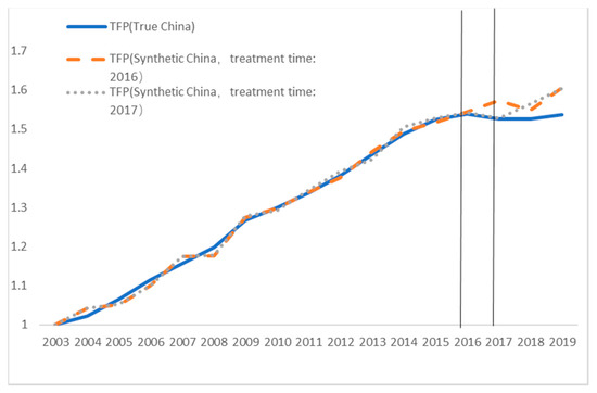 The policy evaluation results of the two quasi-experiments under the synthetic control method are presented in Figure 2. The true China TFP represents the true TFP under the impact of trade policy uncertainty; the synthetic China TFP was simulated from the other sample countries and is independent of the impact of trade policy uncertainty. The difference between the two is the policy effect of trade policy uncertainty on China’s TFP. Prior to policy implementation, the actual China TFP sequence is highly fitted to the synthetic China TFP sequence. After the trade policy uncertainty increases, namely, after the policy implementation, the synthetic curve becomes significantly differentiated from the actual curve. In both experiments, the synthetic China TFP is higher than the true China TFP, which means that trade policy uncertainty reduces China’s TFP. The measurement results of the synthetic control method with 2016 as the policy implementation time show that the average TFP loss caused by trade policy uncertainty to China in 2017 and 2018 was 2.7%; the measurement results of the synthetic control method with 2017 as the policy implementation time show that the TFP loss caused by trade policy uncertainty to China in 2018 was 3.5%.