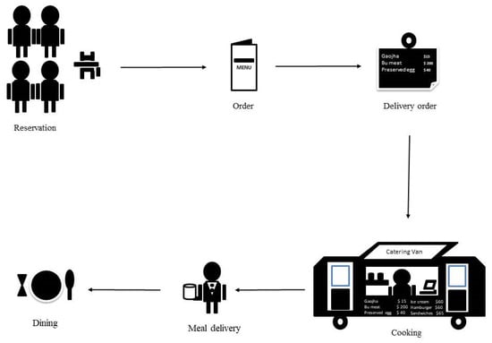 The practicality of the mixed approach was assessed using a case study involving a mobile catering company in Taiwan. In the following section, we introduce a well-established mobile catering company in Taiwan. This firm performs its own branding through its own sales channels. The caterer owns an advanced iPad POS system for ease of use, iCloud, e-receipt, inventory services, and to earn points which allows for the cooking of gaojha, bu meat, and preserved egg. The poster POS software for Windows is a cloud-based Point of Sale tablet application, which enables cafes, shops, and restaurants to manage menus, orders, and supplies quickly and efficiently. In view of the preceding discussion, the five major sets of questions to be addressed for mobile catering are as follows: (1) duly-registered catering; (2) principal place of business; (3) food hygiene for mobile catering; (4) food van modification services; (5) food van safety. We can represent the service procedure of mobile catering in Figure 3 as follows: (1) reservation; (2) order; (3) delivery order; (4) cooking; (5) meal delivery; (6) dining. However, social distancing due to the COVID-19 pandemic has reformed daily lives and consumption practices of individuals. People in social isolation or quarantine mostly think of daily intake and have to follow precautions for food intake. Customers are more concerned about food safety and delivery hygiene during the COVID-19 pandemic. In addition, many consumers have increased their usage of take-away or meal delivery services during the COVID-19 pandemic. Customers take their devices with them everywhere and adding location awareness to mobile apps offers customers a more contextual experience. The location APIs available in Google Play services facilitate the adding of location awareness to your apps with automated location tracking, wrong-side-of-the-street detection, geofencing, and activity recognition. The need to reduce crowding and queuing has forced store managers to implement regulations such as “maximum customers in store” and “the Coupons.com app”.