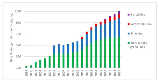 The development of the first three railway lines (the dark and light green lines since 1999 and the blue line since 2004) presented an image of the urban railway as a clean, comfortable, and fast mode of transport which has efficiently attracted young and middle-income people who would otherwise travel by private cars. With the additional two lines of the airport rail link and the purple line, the rail transit ridership has been increasing, as clearly shown in Figure 1. The total number of urban rail transit passengers reached more than 1 million trips per day in late 2019, just prior to the COVID-19 pandemic.