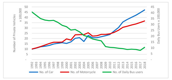 However, due to the limited coverage of the rail transit network and inefficient feeder service, many people still shifted away from public transport and relied heavily on private cars. As evidenced by the decreasing number of bus passengers but continuously rising number of private vehicle registrations at an approximate increase rate of 32.8% per year, as shown in Figure 2.