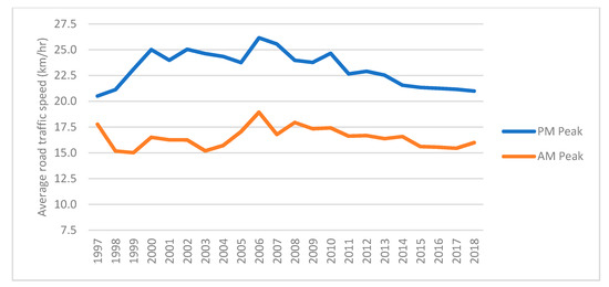 Road traffic congestion continues and is becoming even more severe than before. The average speed on the main road is shown in Figure 3, revealing that the morning congestion is more severe. It is worth noting that during September 2011 and December 2012, the government launched its “first-car policy” that refunded the excise tax to the car buyers to boost the domestic economy. However, this suddenly increased by more than 1.25 million the number of private cars nationwide, including in the severely congested Bangkok area, and has made the traffic more terrible, as reflected by a jump in car registrations and reduced speeds during 2012, shown in Figure 2 and Figure 3.