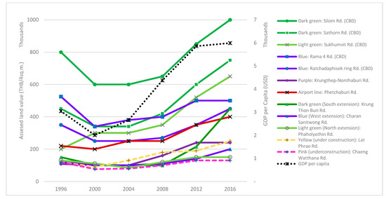 This section investigates the change in land value along the railway corridors. The assessed land value is officially published by the Treasury Department of Thailand every 4 years. The assessment is done over a road section based on locational attributes such as land use category, proximity to main roads, size of a land parcel, etc. The assessed land value is used to levy the property’s taxes over the 4-year period. Figure 4 shows the change of the assessed land value of some selected locations along the present and the near future railway corridors, as published in the years from 1996 to 2016, which were used in 2020 and extended to 2021 due to the COVID-19 pandemic. The GDP per capita is shown to reference the economic status at each period. It is observed that the Asian economic crisis of 1997 was reflected by a drop in land values for several years until the recovery started in 2000. The land value in the CBD along the dark and light green lines has highly appreciated compared with that of the blue line. The areas of the blue, dark green south extension, and airport link line have moderately appreciated. For the newly opened blue line west extension and the under-construction yellow and pink lines, the land appreciated very little. However, a rise in land value along the purple line has been obvious since 2008, when the construction started.