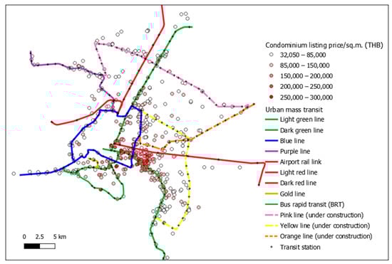 The target residential property was the condominium building located within 3 km (the road network distance) from the nearest station. As the transaction price of the private property sale was not disclosed to the public, this study was based on the listing price of a condominium. Data collection was conducted in September 2021 by gathering the listing price and associated structural characteristics: building age and building category. By screening out the super-luxury properties having a unit price of more than Thai Baht 300,000 per square meter, 512 condominium buildings or projects were used as data for this study. They were both finished, fully furnished, ready-to-move, or under construction. Some condominiums had more than one layout type: studio room, 1-bedroom unit, 2-bedroom unit, duplex unit, etc., resulting in different prices even in the same building. In total, we collected 1374 condominium sale units and determined an average price for each property to be used for the subsequent analysis (n = 512). The descriptive statistic of the condominium unit data is presented in Table 3, and the distribution of listing price per floor area is shown with reference to the corridor of the ten urban railway lines and a BRT line in Figure 5.