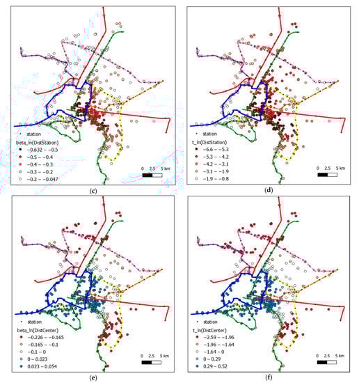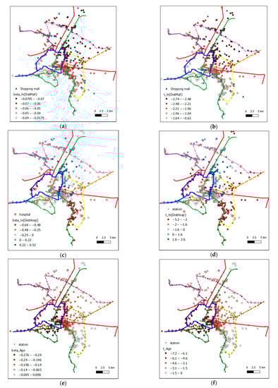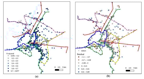 The mapping of the R2 values and residual of the MGWR model at each data location are shown in Figure 6a,b. Obviously, the MGWR model has a good local fit, i.e., strong R2 and small residual, mostly along the existing two green lines and the blue line. However, the model fit is low for the existing purple line and the under-construction pink, yellow, and orange lines.