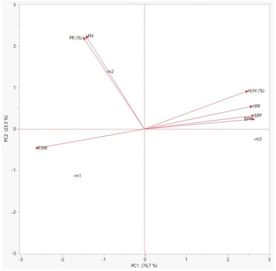 In the biplot diagram of C. maritima (Figure 1), H/H, YPP, SPP and BPP showed a positive correlation. The genotype m2 had a higher PH and PR with respect to the other genotypes. While the m1 genotype stood out in terms of TSW, the m3 genotype had a higher BPP, SPP, YPP and H/H with respect to the other genotypes.