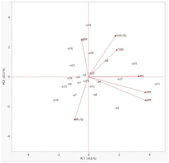Figure 2. Biplot diagram of the protein ratio and agro-morphological properties (protein ratio (PR), plant height (PH), number of seeds per plant (SPP), yield per plant (YPP), thousand seed weight (TSW), hulless/hulled seed ratio (H/H), and number of branches per plant (BPP)) of C. orientalis.