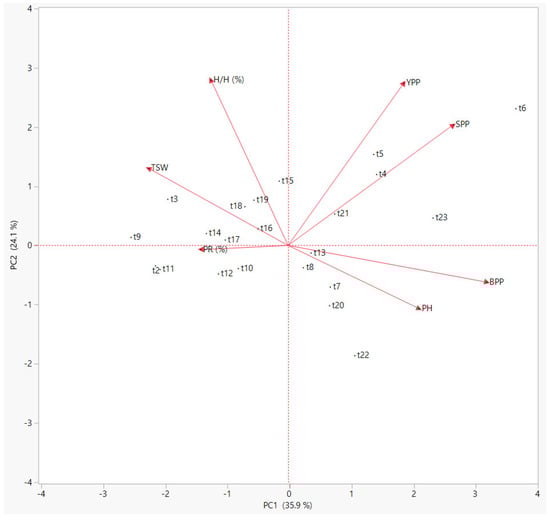 Figure 3 shows the biplot diagram of Crambe tataria accessions. The positive axis of PC1 contained YPP, SPP, BPP and PH, and was comprised of t6, t5, t4, t21, t23, t13, t8, t7, t20 and t22 accessions. The negative axis of PC1 and PC2 contained H/H, TSW and PR, and was comprised of t15, t19, t18, t16, t3, t9, t14, t17, t2, t11, t12 and t10 accessions.