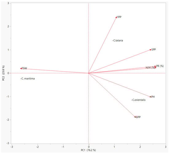 Figure 4. Biplot diagram of the protein ratio and agro-morphological properties (protein ratio (PR), plant height (PH), number of seeds per plant (SPP), yield per plant (YPP), thousand seed weight (TSW), hulless/hulled seed ratio (H/H), and number of branches per plant (BPP)) among the species (Crambe maritima, Crambe orientalis and Crambe tataria).