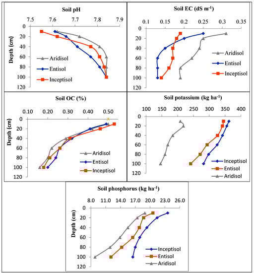 The distribution pattern of EC in profiles of different soil orders under variable land-use systems is depicted in Figure 2. The EC in soils showed significant change with the increase in the soil depth. Among the different soil orders, the maximum EC (0.23 dS m−1) was observed in the profile of order Aridisol while the minimum (0.17 dS m−1) was under soil order Inceptisol. The greater EC under Aridisol may be due to its higher evaporation, leading to the deposition of soluble salts [32]. The higher EC under Aridisols might primarily be also due to greater accumulation of salts in soils [1].