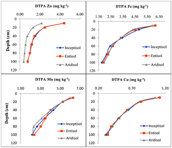 The trend of DTPA-Mn distributed in soil profiles of different soil orders is presented in Figure 3. While determining the effect of soil depth on Mn content, it was observed that the highest Mn was reported in the surface soil layer with the significant subsequent decline in its content with increasing soil depth to least in the deepest (80–100 cm) soil layer. The decrease in the content of Mn with the increasing soil depth corresponds to its fixation by high carbonate contents existing in deeper layers and also due to the dilution effect leading to reduced availability in soils [31]. Our results are in line with the findings that reported the decrease in extractable micronutrient contents over different depths [30,45].