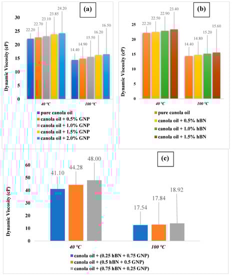 Dynamic viscosity of (a) canola oil incorporated with graphene nanoplatelet (GNP), (b) canola oil incorporated with hexagonal boron nitride (hBN), and (c) canola oil incorporated with both hBN and GNP.