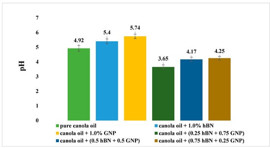 The incorporation of nano additives was observed to increase the pH value of the canola oil-based nano lubricants (Figure 3). It was observed that for the pure canola oil and the formulated nano lubricants, the pH value was less than 7, which refers to their slightly acidic nature. We also noticed that the incorporation of the nano additives to the canola oil reduced its acidity. In addition, it was observed that the hBN nano lubricant was more acidic in nature than the GNP nano lubricant. Amongst the hybrid lubricant mixtures, it was observed that the sample containing a higher concentration of hBN exhibited the lowest acidic nature.