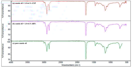 FTIR analysis was performed for the pure canola oil and its formulated nano lubricant samples. The FTIR data provided information on the presence of certain chemical bonds present in the canola oil. The data from the FTIR test were analyzed using the five-zone analysis method [] and summarized in Table 5. The FTIR spectra of the pure canola oil and its formulated nano lubricants are shown in Figure 4.