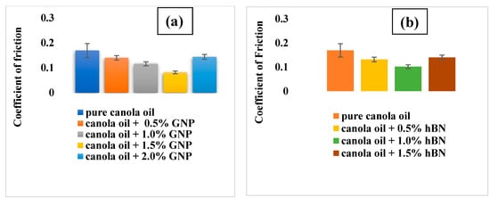 Coefficient of friction at the end of the test for pure canola oil and (a) canola oil with GNP, (b) canola oil with hBN.