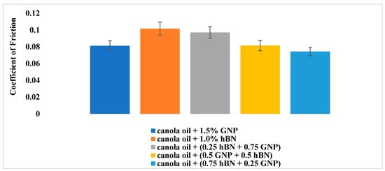 Next, the incorporated nano additives were mixed thoroughly utilizing a vortex mixer (VWR, Radnor, PA, USA) to form nano lubricant mixtures. The mixtures were initially shaken for around 20 min using the vortex mixer at room temperature and then put in an ultrasonicator for 2 h at 60 °C []. The objective of this process was to ensure that the incorporated nano additives were uniformly dispersed in the oil. Initially, the GNP nano additives were incorporated at 0.5, 1.0, 1.5, and 2.0% by weight in a measured amount to the canola oil in order to understand their concentration influence on friction and wear. Later, the hBN nano additives were also incorporated at 0.5, 1.0, and 1.5% by weight in a similar measured amount to the canola oil to study friction and wear performance. Amongst the different concentrations of GNP and hBN nano lubricants prepared, the ones that showed the lowest coefficient of friction and wear volume were considered as the optimum concentrations. These optimum concentrations were further experimented with to analyze the potential synergy of both GNP and hBN conjugate mixture incorporated in the canola oil. To formulate the conjugate mixtures, we took into consideration the optimum hBN (1.0 wt.%) and optimum GNP (1.5 wt.%) concentrations. These optimum mixtures of hBN and GNP-based nano lubricants were mixed in different proportions, such as 25% of 1.0 wt.% hBN + 75% of 1.5 wt.% GNP, 50% of 1.0 wt.% hBN + 50% of 1.5 wt.% GNP, and 75% of 1.0 wt.% hBN + 25% of 1.5 wt.% GNP.