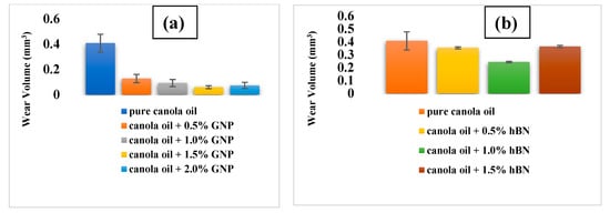 Wear volume data for (a) canola oil with GNP and (b) canola oil with hBN.