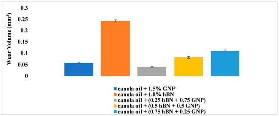 Figure 8 shows the wear volume pertaining to optimum canola oil-based nano lubricants as well as their hybrid mixture of nano lubricants. It was observed that the hybrid lubricant mixtures [canola oil + (0.25 hBN + 0.75 GNP)], [canola oil + (0.5 hBN + 0.5 GNP)], and [canola oil + (0.75 hBN + 0.25 GNP)] provided a reduction of wear volume by 90, 80, and 73% compared to the pure canola oil. It was noted that a higher concentration of hBN in the hybrid nano lubricant mixture was not beneficial for reducing wear volume. It could be observed that the mixture [canola oil + (0.25 hBN + 0.75 GNP)] was providing a synergistic result compared to the other formulated nano lubricants.