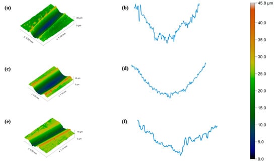 3D optical profilometer images (10X magnification with scan area of 1.19 × 0.89 mm2) and 2D images of worn disk for (a,b) canola oil + 1.5% GNP, (c,d) canola oil + 1.0% hBN, and (e,f) [canola oil + (0.25 hBN + 0.75 GNP)] samples.