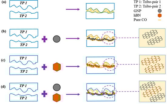 Schematic diagram explaining lubrication mechanism of (a) pure canola oil, (b) canola oil + 1.5 wt.% GNP, (c) canola oil + 1.0. wt.% hBN, and (d) [canola oil + (hBN + GNP)] samples. [CO means canola oil].
