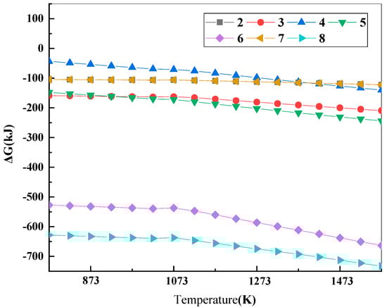 Reaction (2)–(8) Gibbs free energy change with temperature graph.