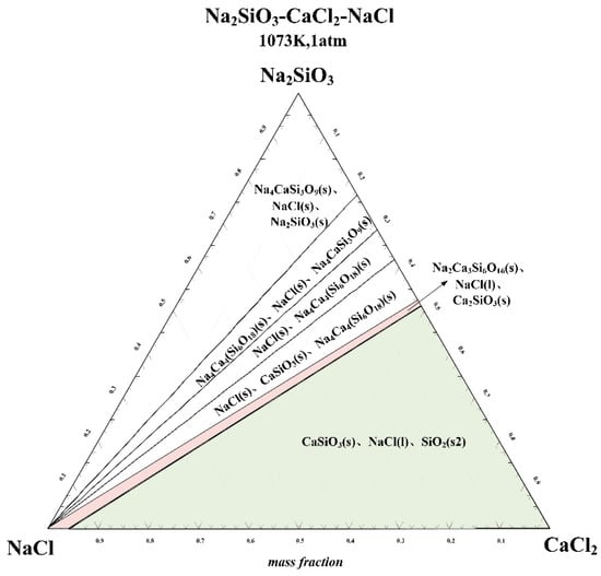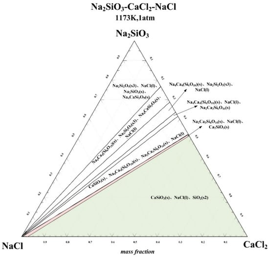 The thermodynamic ternary phase diagrams of pure substances in the system NaCl-CaCl2-Na2SiO3 at a temperature of 1073 K and 1173 K are shown in Figure 4 and Figure 5.
