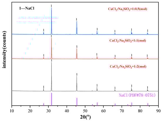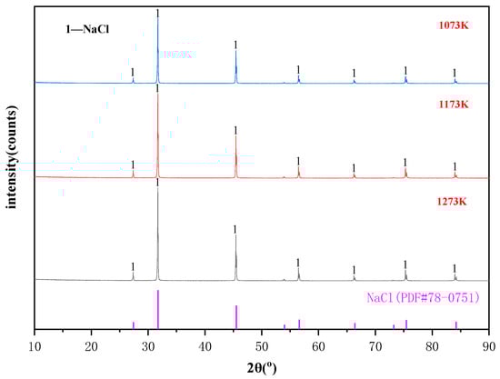 The influence of temperature on the high-temperature phase conversion rule of CaCl2 in molten salt chlorinated slag was determined. The experiment was carried out under the condition that the content of CaCl2 in the raw material was 10%. The amount of additive CaCl2:Na2SiO3 molar ratio was 1:1. The reaction temperature was 1073 K, 1173 K, and 1273 K. The phase detection results of the filtrate are shown in Figure 8.