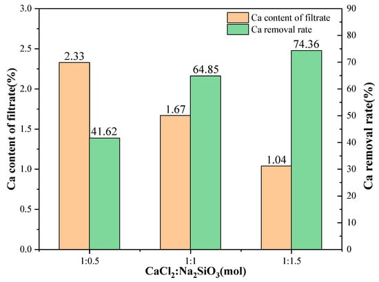 The change in the removal rate of Ca of the filtered sample under different additive dosages is shown in Figure 7. When the amount of additives increases, the removal rate of Ca of the sample shows an upward trend. The higher the removal rate of Ca, the higher the quality of the recoverable molten salt will be. However, more additives will introduce Si impurities into the molten salt. In order to ensure the quality of molten salt, the experiment determined that the appropriate amount of Na2SiO3 should be selected. The molar ratio of CaCl2:Na2SiO3 should be kept between 1:1 and 1:1.5. When achieving a higher Ca removal rate, the quality of the collected molten salt should also be higher.