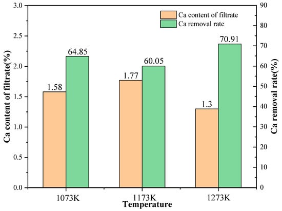 The Ca content in the filtrate at different temperatures is shown in Figure 9. The Ca content in the filtrate increased from 1.58% to 1.77% and finally changed to 1.30% when the reaction temperature was increased from 1073 K to 1273 K. In the temperature range of 1073–1273 K, the Ca content in the filtrate first increased and then decreased with the increase of additive dosage. When the CaCl2:Na2SiO3 molar ratio reached 1:1, the lowest content of Ca in the filtrate was achieved at the reaction temperature of 1273 K.