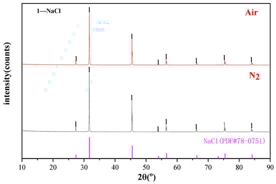The filtrates obtained by the filtration operation were examined under different reaction atmospheres to investigate the effect of reaction atmosphere on the phase conversion of the products after phase conversion. The results of the physical phase analysis of the filtrate under different atmospheric conditions are shown in Figure 10. It can be seen that the results of the physical phase detection of the resulting filtrate under different atmospheres were all sodium chloride, which basically did not contain diffraction peaks of other substances, indicating that the phase conversion experiments under N2 conditions do not affect the quality of the recovered new molten salt.
