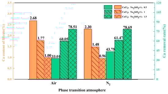 The detection of Ca content in the filtrate under different atmospheric conditions showed that the N2 phase conversion conditions could effectively reduce the content of Ca elements in the filtrate and improve the quality of the recovered new molten salt. The rate of Ca removal under different atmospheric conditions was investigated, and the results are shown in Figure 11. It can be seen that, when the phase conversion removal is performed under air or N2 conditions, the Ca removal rate under nitrogen atmosphere is higher than that under air atmosphere when the additive content is certain. When the phase change atmosphere was N2 and the additive CaCl2:Na2SiO3 (mol) value was changed from 1:0.5 to 1:1.5, the conversion rate of Ca removal rate reached 78.69%. When the amount of additives used is certain, the Ca removal rate after the filtration operation under N2 conditions is greater than that under air atmosphere conditions, when the N2 conditions are selected for the phase transformation atmosphere to maximize the Ca removal rate.