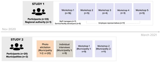 This paper is based on two qualitative studies performed in collaboration with three public organisations in Sweden. Data collection was conducted between November 2020 and May 2021 (covering the second and third pandemic waves) and involved different research methods. The participating organisations were from the public sector, providing a wide variety of services with some jobs that are mainly onsite and in direct contact with citizens (patients, school pupils, etc.) and some that can be performed remotely (planning, administration, certain meetings, etc.), both during and after the pandemic restrictions were in force. The organisations had not yet devised a post-pandemic strategy for remote and on-site work at the time of data collection. The two studies were triggered by a need to identify work environment challenges and potentials for improvement that emerged as a result of the pandemic. In total, the two studies involved 53 participants (see Figure 1 for an overview) who worked part- or full-time from home due to the pandemic.