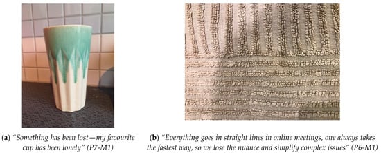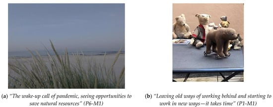 Examples of the participants’ photos and reflections: (a) opportunities for sustainable development; (b) challenges in finding new ways of working.