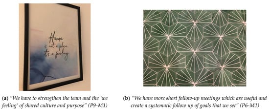 Figure 4. Examples of the participants’ photos and reflections: (a) creating a sense of belonging and strengthening team cohesion; (b) leading the group towards organisational goals. - Navigating increased complexity and personalising leadership styles to support the diversity of individual employees depending on their needs, tasks, and preferences.