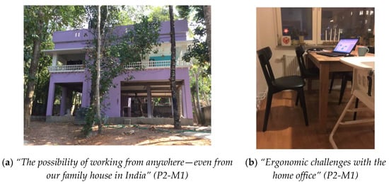 Examples of the participants’ photos and reflections on: (a) work from anywhere; (b) physical ergonomics of working from anywhere.