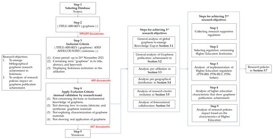 As mentioned above in the introduction, this research has two main objectives; (1) to analyze the achievements of Indonesia’s graphene research and (2) to investigate the relationship between Indonesia’s higher education policies and graphene research achievements. For this purpose, a complete flow of the research is depicted in Figure 1.