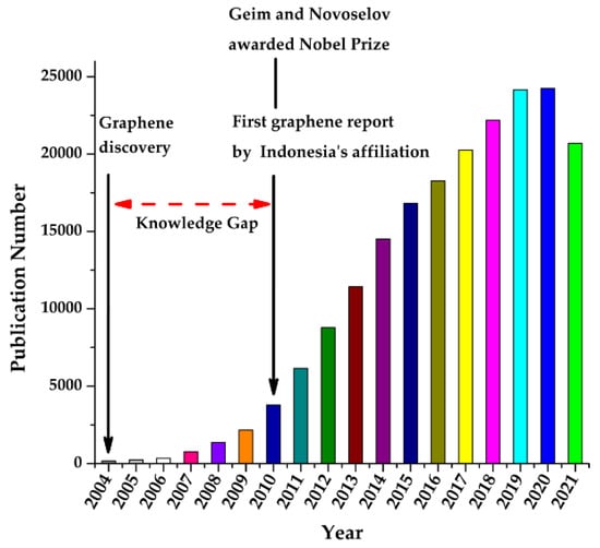Before we display the publication result from Indonesia’s institution, it is essential to show the knowledge gap between Indonesia and global research in terms of AdMs represented by graphene. Since its discovery in 2004 [], the number of graphene-related publications has remarkably increased. Figure 2 illustrates the surge of graphene publication from 2004 to the present; more than 196,000 papers were published during this period. Therefore, graphene is considered a suitable proxy to assess the awareness of research institutions on the global issue of AdMs research. The year 2010, when graphene inventors were awarded Nobel prizes, coincided with the first publication that displayed Indonesia’s affiliation []. This six-year knowledge gap finding can help answer the question of how far Indonesia—as one of the developing countries, lags behind in terms of materials research.