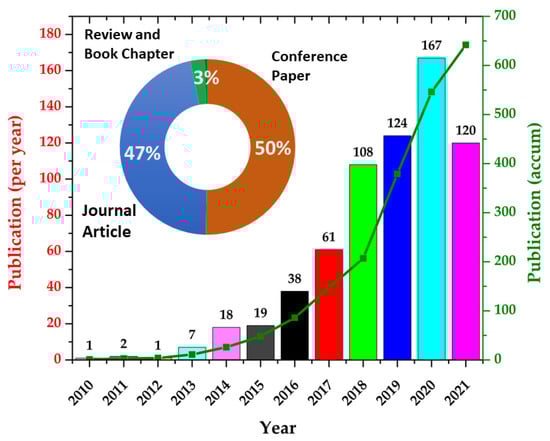 The fourth step was dataset validation. In order to ensure all publications in this study were concerned explicitly with graphene, further data cleaning was performed. Publications not concerned with graphene research were excluded. The validation was conducted through manual checking by the research team. The criteria for the validation was as follows: (1) publications concerning the basic or fundamental knowledge of graphene, (2) publications on how to create, fabricate, and graphene materials, (3) publications concerning the characterization of graphene materials, and (4) publications concerning the real application of graphene. After validation, the dataset retained 667 documents, which comprised 330 conference papers, 315 journal articles, 19 reviews, and three books. The analysis was mainly focused on this dataset. Data is contained within Supplementary Material. The general Indonesia graphene publication achievement is reported in Section 3.2. The analysis of publications based on affiliation is in Section 3.3, and institutions productive in graphene research were investigated. Further investigation in terms of geographical distribution is displayed in Section 3.4. All affiliations were mapped based on their geographical location.