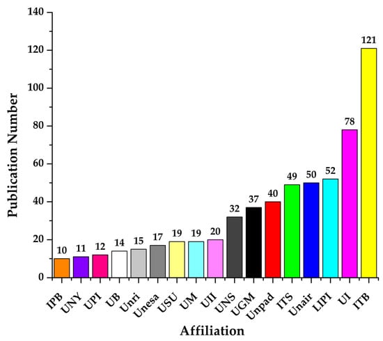 Here, we filtered the publications based on affiliation. Considering graphene is a relatively new topic, the requirement for a minimum publication rate during a decade was set at one per year. With this requirement, 17 universities and one research institute successfully emerged. Surprisingly, one university published more than 100 documents between 2010–2021: Institut Teknologi Bandung (ITB), with 121 documents. Universitas Indonesia (UI) followed in the second rank with 78 documents. Indonesian Institute of Science (LIPI), Universitas Airlangga (Unair), Institut Teknologi Sepuluh November (ITS), showed a tight number of publications with 52, 50, and 49 documents. Universitas Padjajaran (UNPAD), Universitas Gadjah Mada (UGM) and Universitas Negeri Sebelas Maret (UNS) have contributed with 40, 37, and 32 documents, respectively. A total of 20 documents was shared by Universitas Islam Indonesia (UII). A similar productivity rate of 19 documents were displayed by Universitas Negeri Malang (UM) and Universitas Sumatera Utara (USU). Lastly, a sequential publication number was shown by Universitas Negeri Surabaya (Unesa), Universitas Riau (Unri), Universitas Brawijaya (UB), Universitas Pendidikan Indonesia (UPI), Universitas Negeri Yogyakarta (UNY) and Institut Pertanian Bogor (IPB) with 15, 14, 12, 11, and 10 documents respectively. Combined, these 17 affiliations has successfully contributed 596 documents; hence, they already shared 89% of the entire decade of publication. The distribution of publications based on the criteria is shown in Figure 5.