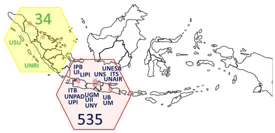 Figure 5 and Figure 6 enhanced the investigation; the publication is explored based on its affiliation and geographical location, respectively. One can conclude that affiliations in Java Island contributed to 93% of Indonesia’s graphene research publications. This finding represents the actual condition of development in Indonesia. It confirms that the socio-economic development of Indonesia is centralized in Java Island. Many universities on this island are privileged with most research facilities, funding, and high-quality researchers. Finally, this region has become the home for notable universities and research institutions, particularly those possessing materials science and engineering disciplines. Eventually, universities can also potentially impact sustainable regional economies in numerous ways. The existence of universities will bring a so-called ‘milieu’, or colocation effect []. The universities may be able to act as a substitute for agglomeration economies by encouraging scientists, engineers, and entrepreneurs to reside in areas where there is a concentration of highly educated who are doing research and employed by the university [].