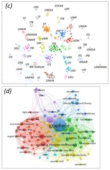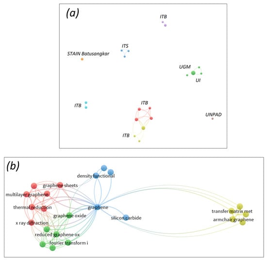 During 2010–2015 (Figure 7a), research groups that published a minimum of two documents were clustered and displayed. Total publications in this period were 48 documents. It can be seen that the research groups are still few and mostly not connected. Moreover, in the early years, many publications obtained were from academic staff collaborating or pursuing their Ph.D. abroad. For example, UI and UGM collaborated with National University of Singapore (NUS), and IAIN Batusangkar with Universiti Kebangsaan Malaysia (UKM). Figure 7b identifies the keywords most used in the publication, including “density functional”, “transfer matrix”, “armchair graphene”, “X-ray diffraction”, and “Fourier transform infra-red”. It indicates that graphene topic research mainly focuses on characterization, theoretical study, modeling, and simulation [,,,,,]. The most striking institution is ITB, which has many research groups, including those devoted to spectroscopy analysis and metal-graphene hybrid [,].