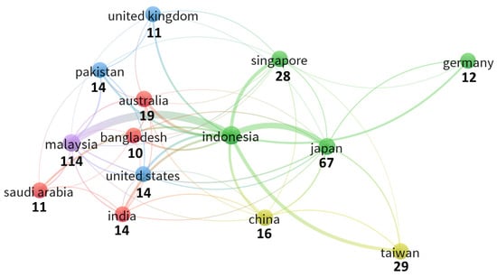 In science and technology policy, co-authorship is used as a proxy for research collaboration []. If two scientists have co-authored a publication, they are regarded as linked, and these sorts of relationships between two scientists eventually form co-authorship networks []. Scientists from various study fields and geographical regions may join in a single co-authorship network. Figure 8 shows the mapping of co-authorship in graphene publications during 2010–2020. It showed the countries that have a minimum of ten shared publications with Indonesian affiliations. The thickness of the curves link represents the amount of shared publications. Based on the thickness link that represented the co-authorship number, it can be observed that the top four collaborators are from Asian countries. Here, the thickest link connected Indonesia and Malaysia, resulting in the highest number of co-authorships with 114 documents. In the second rank, Japan emerged with 67 documents. The collaboration with Taiwan and Singapore produced 29 and 28 documents, respectively. The documents number from Singapore indicated that geographical location does not enormously impact the collaboration rate. This indication is also supported by document numbers from collaborations with a relatively close neighbor, Australia, that only provided 19 documents. China, India, Pakistan, and the United States, at varying distances from Indonesia, display a relatively similar document number. It also can be observed that Indonesia has shared publications with European countries, represented by Germany and the United Kingdom, showing 12 and 11 documents, respectively. Saudi Arabia and Bangladesh shared the publication of about 11 and 10 documents.