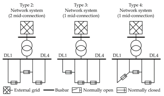 The distribution system described in Figure 1 was defined as Type 1. This is the basic topology of the NDS that links the endpoints of the four feeders. The three different topologies are described in Figure 2. Type 2 represents the mid-linkage of the two feeders when the line lengths of the four feeders are the same. In addition, Types 3 and 4 represent the mid-linkage of one feeder when the line length of one feeder (DL1, DL2 each) is shorter than the others.