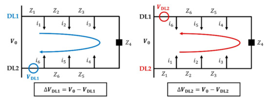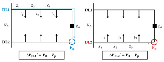 The voltage difference between the entrance of each feeder and a specific location can be calculated by Equation (8). Figure 4 can be applied for each case (left: DL1, right: DL2). Similar to Formula 1, it is assumed that both feeders are radial operations.
