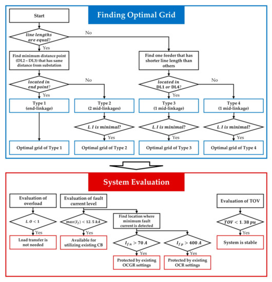 Figure 7 shows a detailed algorithm of the proposed methodology. First, we found the optimal grid of NDS according to the conditions of existing radial feeders. Second, we evaluated the necessity of load transfer, availability of existing CBs, relay settings, and system stability.