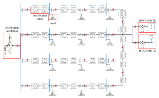 Figure 8 represents the grid model of MV NDS using PSCAD/EMTDC. This is composed of a distribution substation, overhead and underground lines, loads, and distributed generation with a transformer. Detailed parameters including sequence impedance, rated power, and voltage are described in Figure 1 and Table 1. The main transformer (M.TR) connection types are determined by . A neutral grounding reactor (j0.6 ohm) that is the effective grounding standard of KEPCO is connected to the neutral point of to limit the neutral fault current. In addition, distribution lines are modeled with a three-phase -equivalent circuit, and the loads are characterized by constant impedance type. The model of distributed generation is composed of SBDG (synchronous-based distributed generation) and IBDG (inverter-based distributed generation). The SBDG model consists of a synchronous machine, exciter, hydro governor, and hydro turbine. The IBDG model is composed of an AC–DC–AC converter (grid-side, generator-side) and controls, a permanent magnet synchronous machine (PMSM), and a low-pass filter. Basic functions such as low voltages ride through (LVRT) and a fault current limiter are modeled. SBDG and IBDG are interconnected to the endpoint of DL2 with a two-winding transformer.