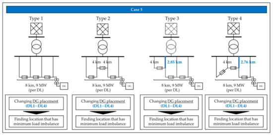 Methodology 1 consisted of five cases (Cases 1–5). First, detailed setups for analyzing the load imbalance of each topology (Types 1–4) with multiple grid conditions are described in Figure 9. Case 1 represents the load imbalance analysis of Type 1 with various line lengths of DL1. In addition, Cases 2–4 represent the load imbalance analysis of Types 2–4 by changing the position of the mid-linkage point.