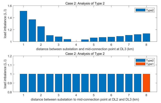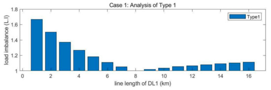 Figure 15 shows the load imbalance analysis results of Case 4. Similar to Case 3, most of the load imbalance results for Type 4 are lower than those for Type 1 (8 km). This indicates that introducing Type 4 is better than Type 3 when one feeder (DL2) is shorter than the others. In contrast to Case 3, load imbalance cannot be minimized to 1, and there exists a certain load imbalance between feeders. The minimum load imbalance is 1.103 when the mid-linkage point is 2.76 km far from the substation. This can also be applied when DL3 is short by linking the endpoint of DL3 to the middle of DL2. Furthermore, introducing Type 3 has the advantage of reducing the line extension cost compared to Type 1 because of the decreased line length needed for linkage.
